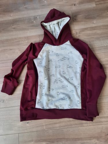Az Alapszín a pulóver ujján, hátán és az eleje középső részén, valamint a kapucni vagy gallér külső oldalán jelenik meg, a Másik szín/minta a pulóver elejének oldalsó részén és a kapucni vagy gallér belső oldalán, a Passzé pedig a pulóver alján és a mandzsettán, valamint az eleje középső részének két szélén, hangsúlyos csíkként. Passzé helyett lehet kérni az alapszín anyagából is a pulóver alját és mandzsettáját, viszont ez kevésbé rugalmas anyag mint a passzé. Az ilyen, vagy ehhez hasonló egyéni kéréseket kérlek, hogy írd be a megjegyzéshez, vagy vedd fel velem a kapcsolatot az szettevetteinfo@gmail.com címen.