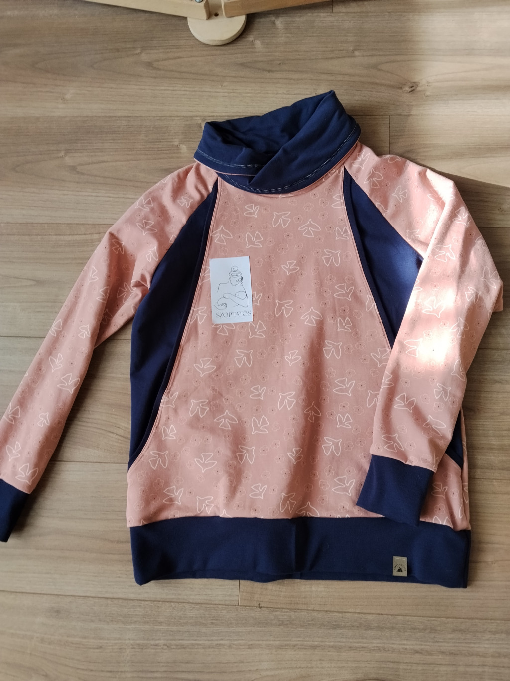 Rózsaszín galamb mintás A-vonalú szoptatós pulóver gallérral L-es méretben. Vastagabb anyag!