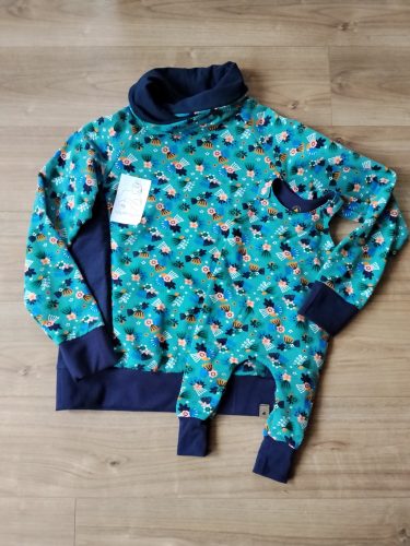 Zöld alapon virágos cipzáros szoptatós pulóver és kantáros baba nadrág (L, 62-68)