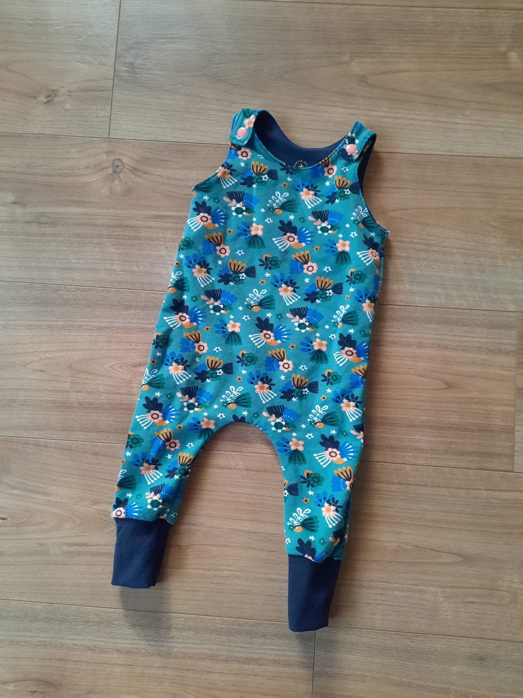 Zöld alapon virág mintás kantáros nadrág 62-68-as méretben.